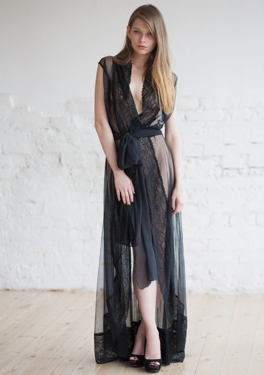 Роскошный халат из сетчатой ткани украшен кружевом. Широкий пояс из этой же ткани подхватывает талию. От обнаженного тела, прикрытого полупрозрачной тканью, захватывает дух.