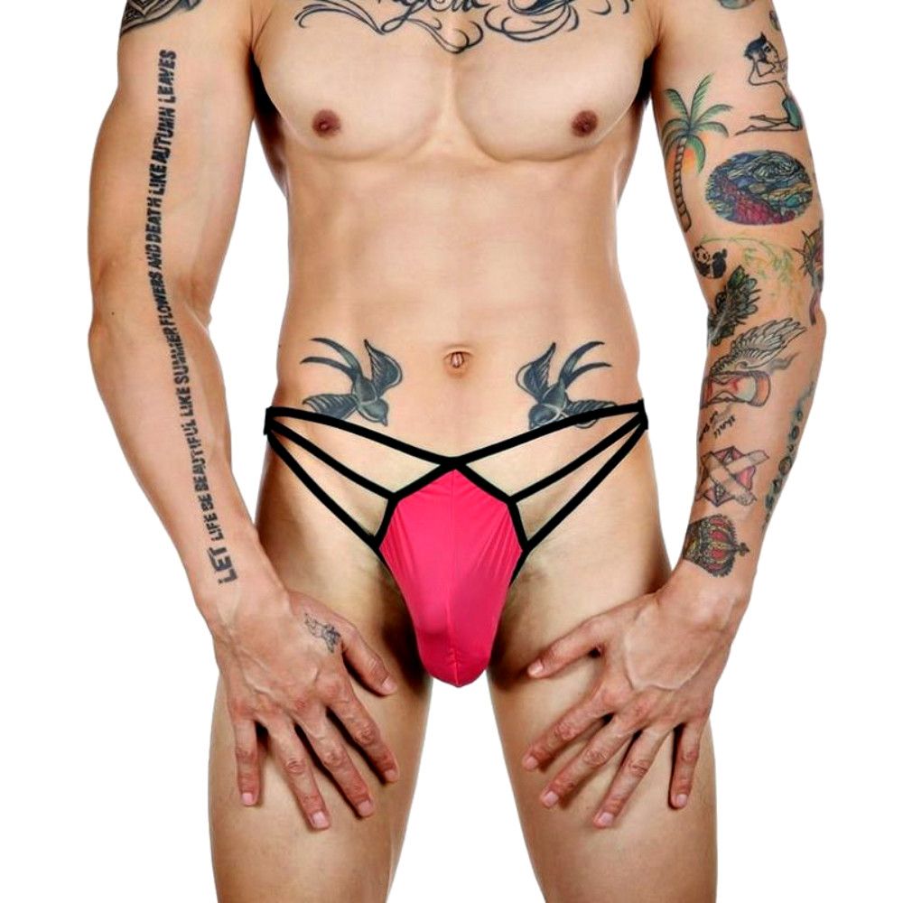 Розовые сексуальные трусы-стринги на тонких черных бретелях.