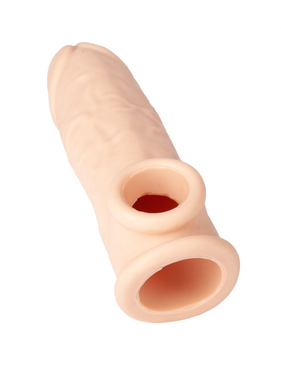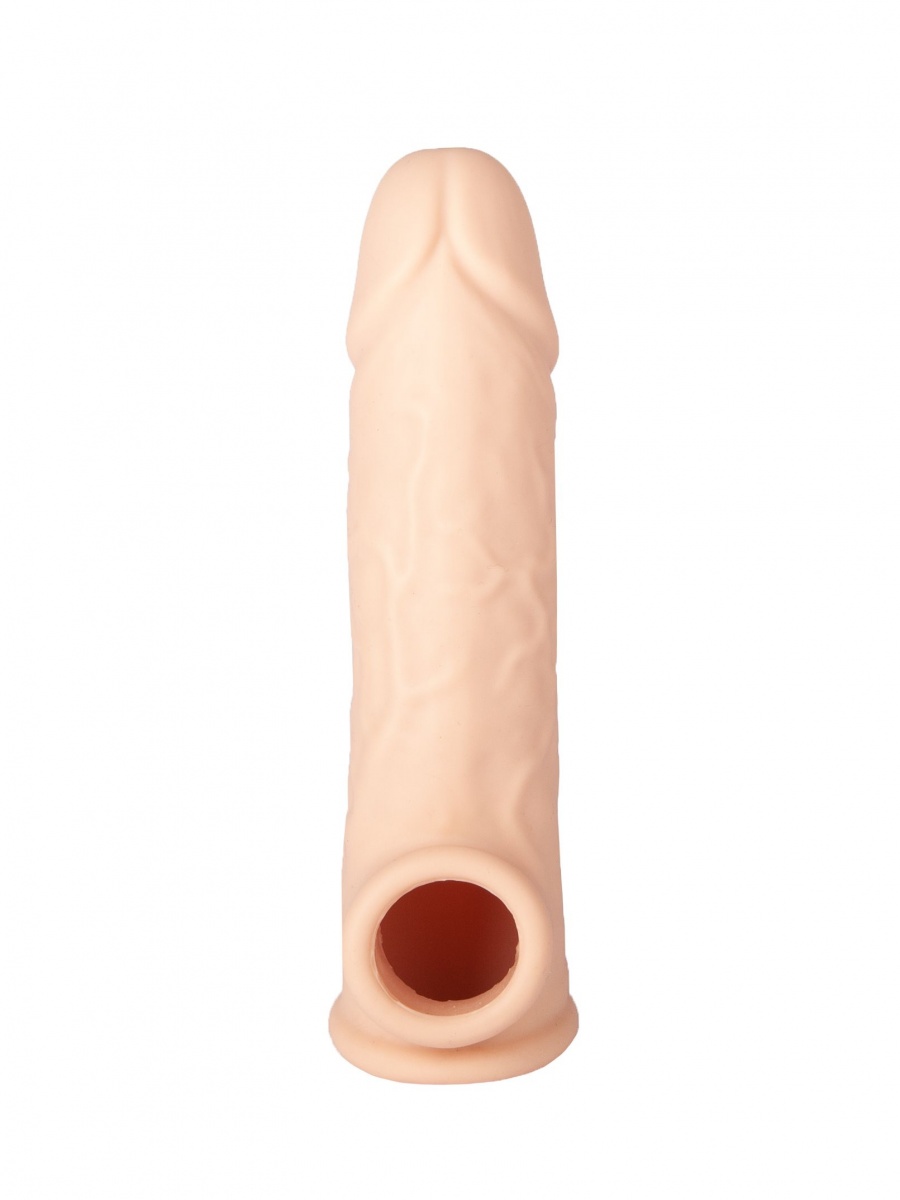 Телесная удлиняющая насадка с отверстием для мошонки выполнена из приятного на ощупь силикона. Имеет реалистичную форму и богатый рельеф поверхности. Хорошо растягивается и плотно облегает. Рабочая длина - 10 см.