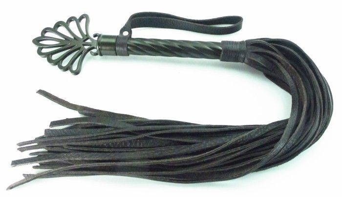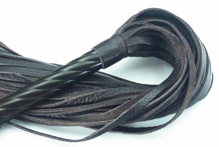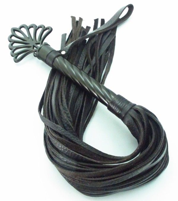 Плеть с рукоятью цвета шоколада и хлыстами из натуральной кожи. Рукоятка с рельефной поверхностью украшена своеобразной короной, имеет кожаный ремешок-петлю для удобного использования, Длина рукоятки- 25,5 см., длина хлыстов - 40 см.