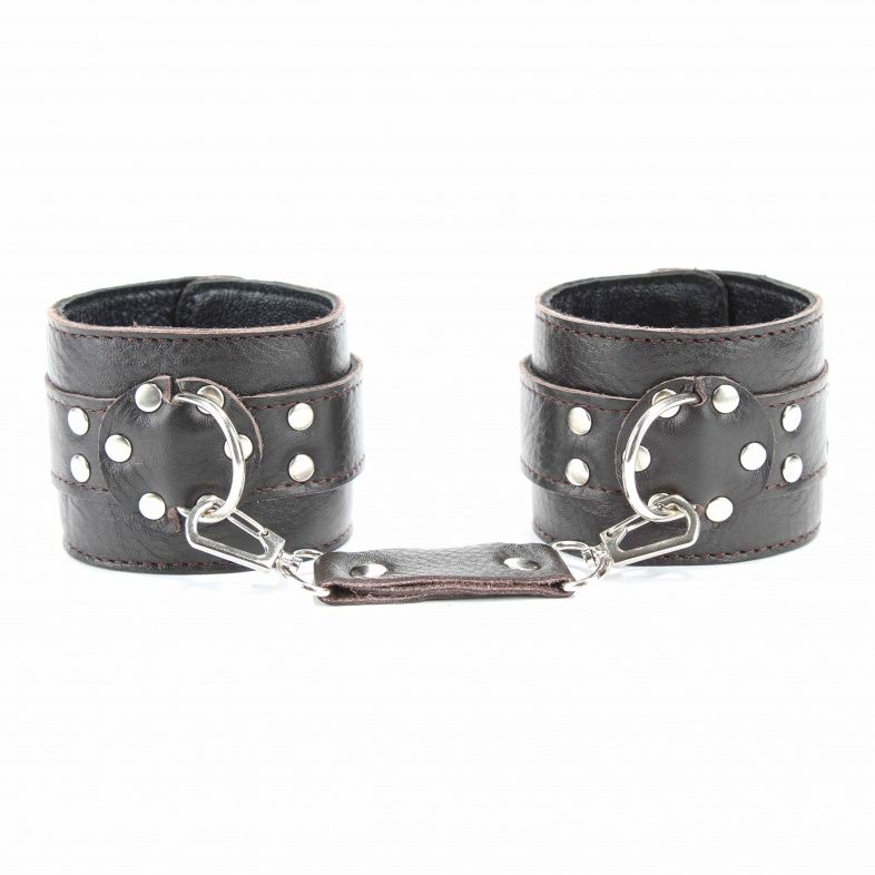 Черные кожаные наручники на металлической цепочке. Выполнены с заклепками из металла.