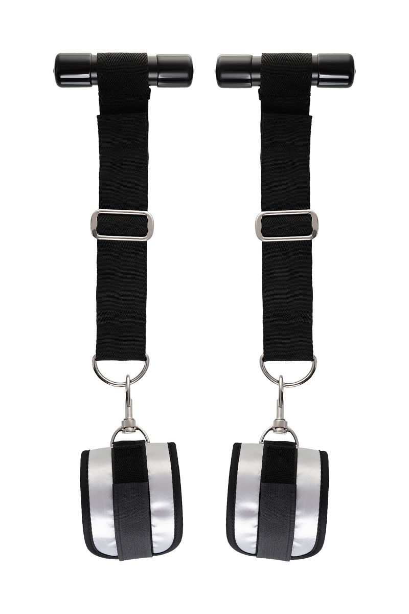 Оставьте наручники и кровать в прошлом веке, пора играть по-взрослому. Фиксаторы для рук на дверь для смелых и терпеливых. Больше позиций для получения удовольствия без силовых затрат! Пластиковые цилиндры фиксируются за дверью, наручники крепятся на запястьях с помощью застежки велкро. Размер легко регулируется ремешками и подойдет для запястий любого размера. Серебряный цвет с черными ремешками смотрится элегантно. Внутренняя часть наручников мягкая и не доставляет дискомфорта во время использования. Фиксаторы с помощью двери дают вам больше свободы для реализации фантазий. Не нужно напрягаться, чтобы удерживать руки вверху, не нужно контролировать своего партнера, если хочется удержать его стоя. Эта оригинальная форма бандажа выведет вас на новый уровень наслаждения с доверием. Длина ремней - 26 см. Ширина манжет - 7 см.