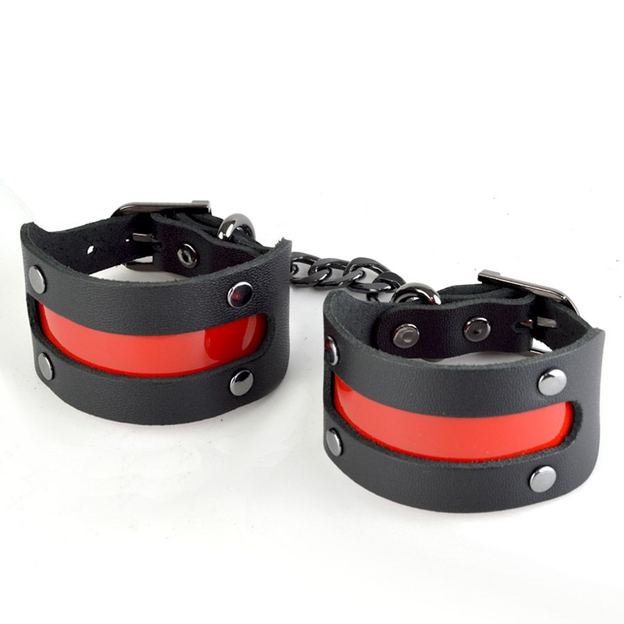 Наручники изготовлены из натуральной кожи и декорированы яркой красной вставкой из экокожи. Общая длина наручников - 25 см. Ширина манжет - 4 см.