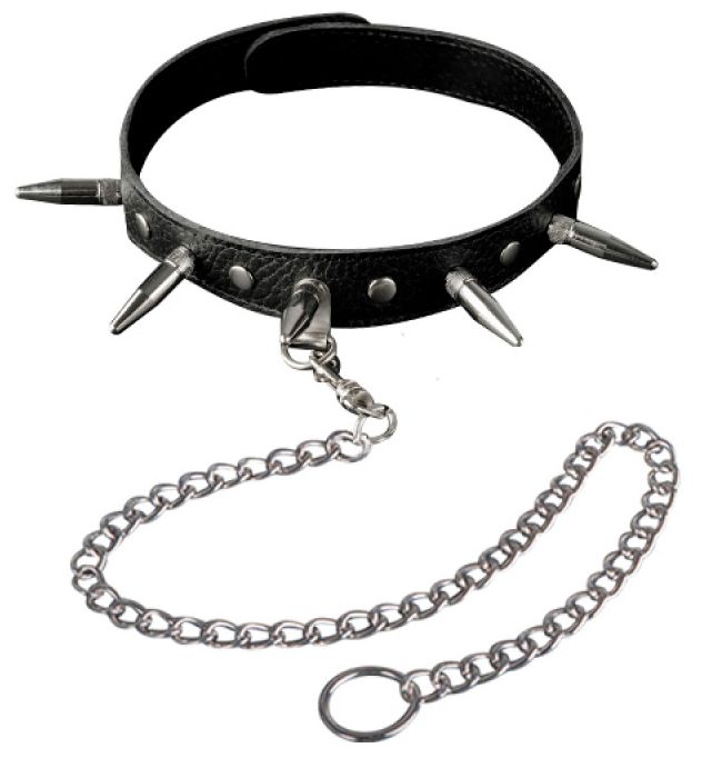 Изготовлен из натуральной кожи с велюровой подкладой. При изготовлении использована никелированная фурнитура. Размер универсальный, регулируется при помощи кнопок. Один из основных атрибутов BDSM. Ширина - 2 см. Длина шипов - 2,5 см. Длина цепочки (поводка) с карабином - 50 см.