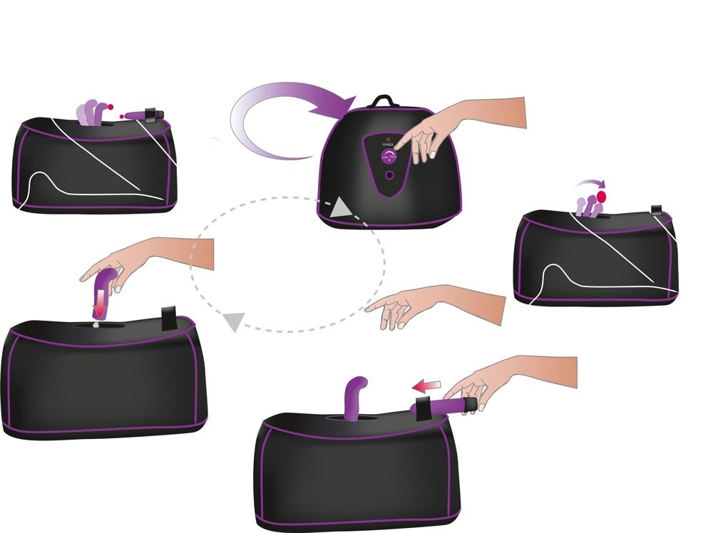 Секс-машина G-Spot Mashine. Представляет собой основание с отверстием под вибратор. Угол наклона вибратора можно менять. Машина работает от сети. Регулировка скорости осуществляется рычажком сбоку. В комплекте с вибратором идут 2 насадки - с шипами и с изогнутым кончиком для массажа G-точки. Может использоваться мужчиной для анальной стимуляции. Размеры машины - 37 х 27 х 18 cm. Длина вибратора - 12,5 см., диаметр - 2,7 см.